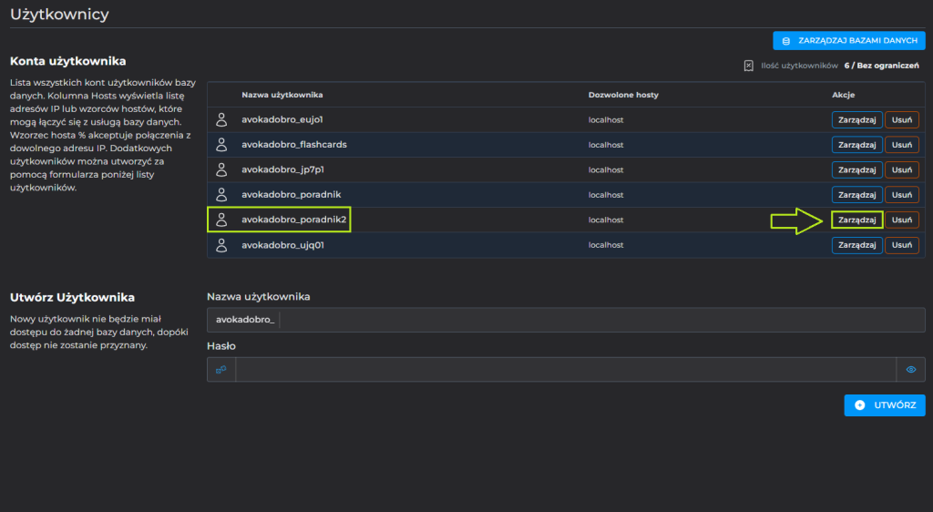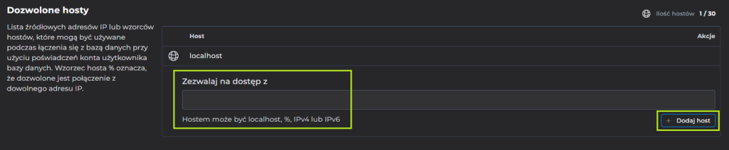 Następnie podajemy nr IP lub znaczek % dający dostęp wszystkim i klikamy „Dodaj host”: