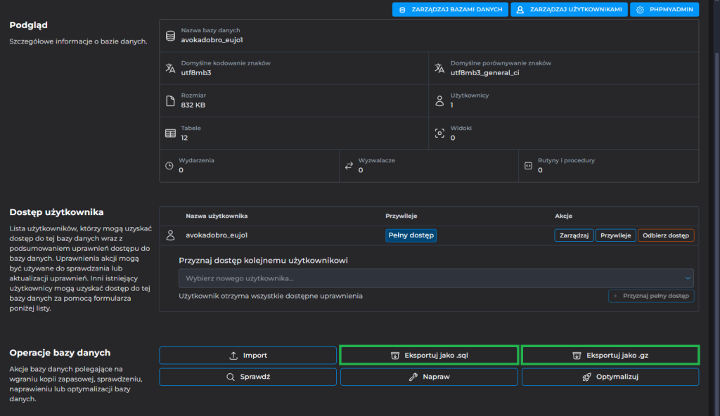 Teraz należy kliknąć ,,Eksportuj jako .sql” lub ,,Eksportuj jako .gz” w zależności od tego, jakie rozszerzenie potrzebujemy.