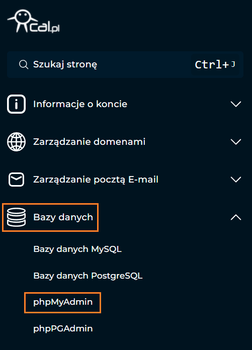 PhpMyAdmin jest dostępny dla każdego konta. Aby się zalogować wystarczy zalogować się na panel.cal.pl i wejść w opcję „Bazy danych” a następnie „phpMyAdmin”: