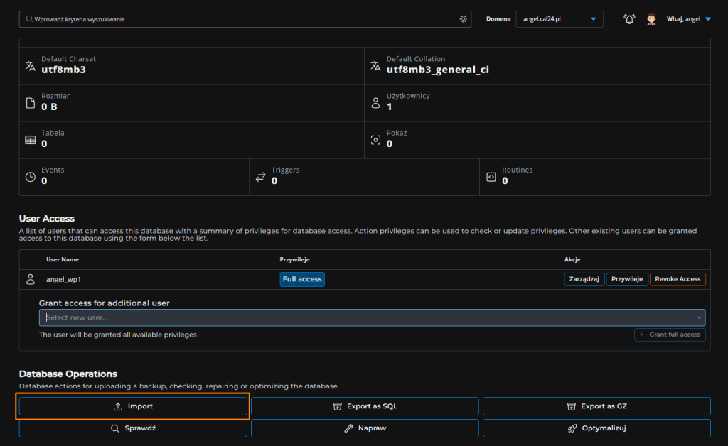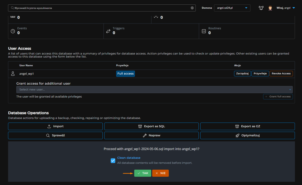 Teraz musisz wybrać plik bazy danych, który został pobrany przez Ciebie kilka kroków wcześniej. Następnie potwierdź importowanie bazy klikając 'Tak’.