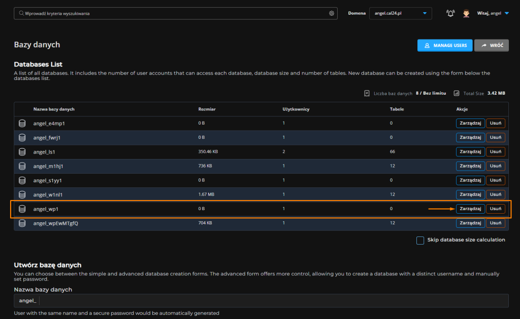 Z listy bazy danych obok wybranej bazy danych kliknij ’zarządzaj’.