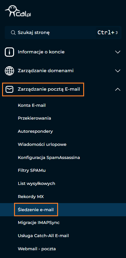 Z menu zakładek wybierz „Zarządzanie pocztą E-mail„, a następnie „Śledzenie e-mail„.