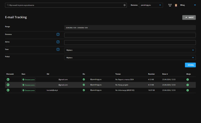 Za pomocą dostępnych pól możesz precyzyjnie filtrować swoje wiadomości według wybranej domeny lub adresu e-mail, a także na podstawie ich statusu oraz tego, czy też pokazać maile wysłane czy odebrane.