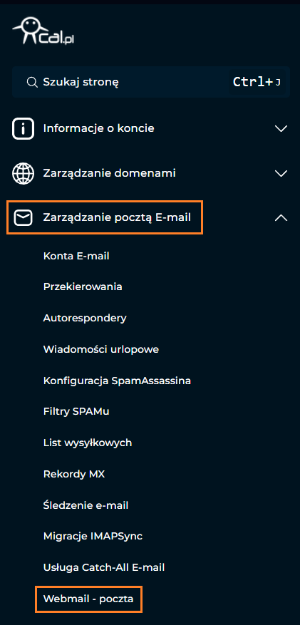 Jeżeli jesteśmy zalogowani do Direct Admin wejść w Zarządzanie pocztą e-mail a następnie w Webmail – poczta a również zostaniemy wykierowani na stronę poczta.cal.pl