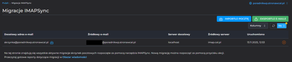 Jeśli wszystkie dane zostaną podane prawidłowo, otrzymasz pozytywny komunikat oraz zobaczysz zleconą migrację. Gdy pozycja zniknie to znaczy, że została ona zakończona.