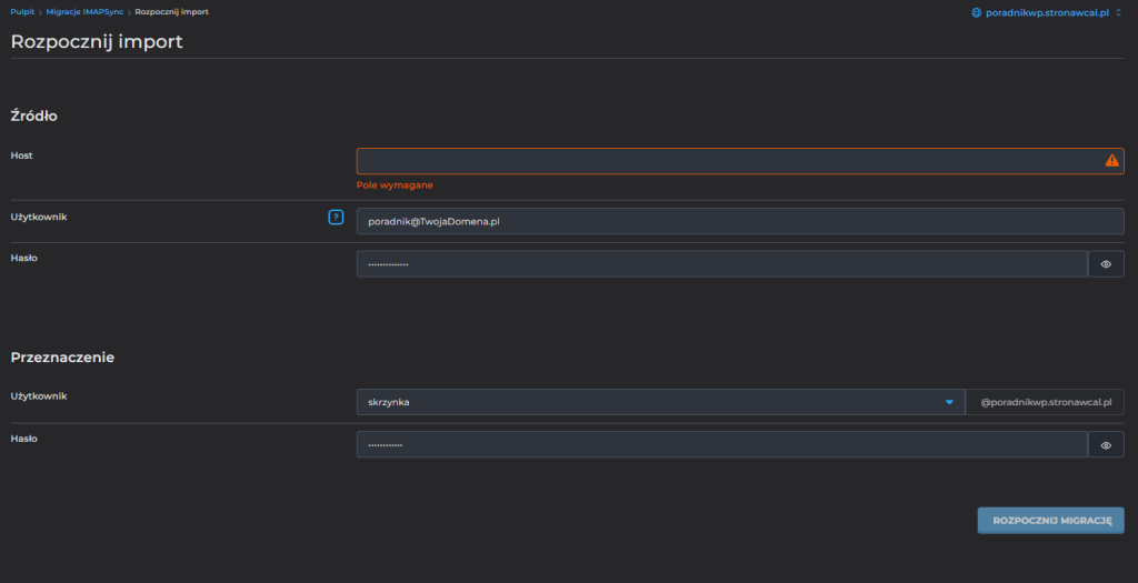 Host – podaj host serwera poczty u aktualnego dostawcy. Może to być mail.nazwaTwojejDomeny, nazwaSerwera.usługodawca. Jeśli nie masz pewności, to zapytaj swojego aktualnego dostawcy. Upewnij się, że adres serwera, który zamierzasz podać jest prawidłowy.