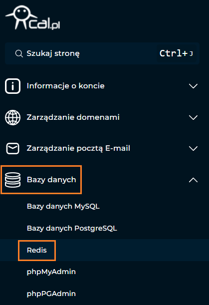 W celu uruchomienia Redis należy po zalogowaniu się do panelu DirectAdmin na panel.cal.pl w menu “Bazy danych” wybrać “Redis”: