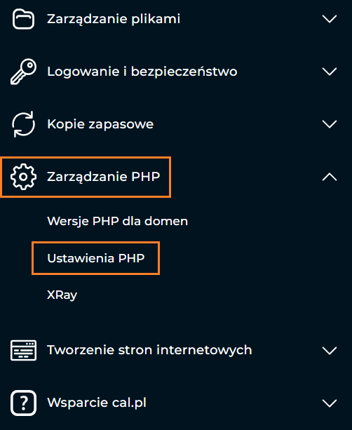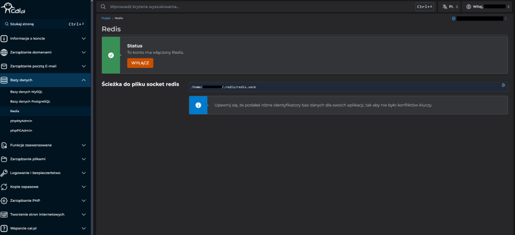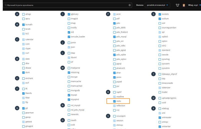Aby umożliwić połączenie z Redis w PHP należy włączyć obsługę Redis przechodząc do menu “Zarządzanie PHP”, a następnie “Ustawienia PHP”. Należy odszukać funkcję Redis i ją włączyć.