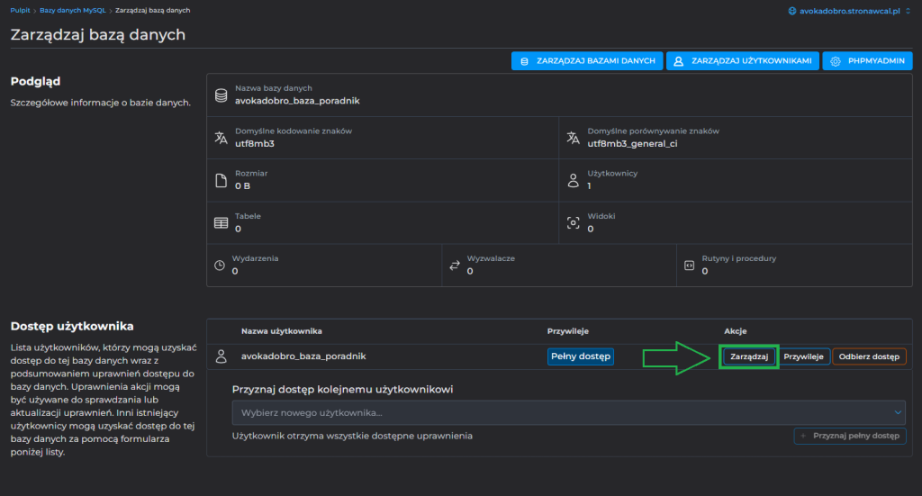 Następnie, przy naszej bazie danych należy kliknąć w przycisk ,Zarządzaj: