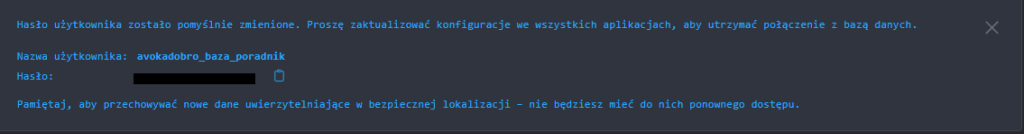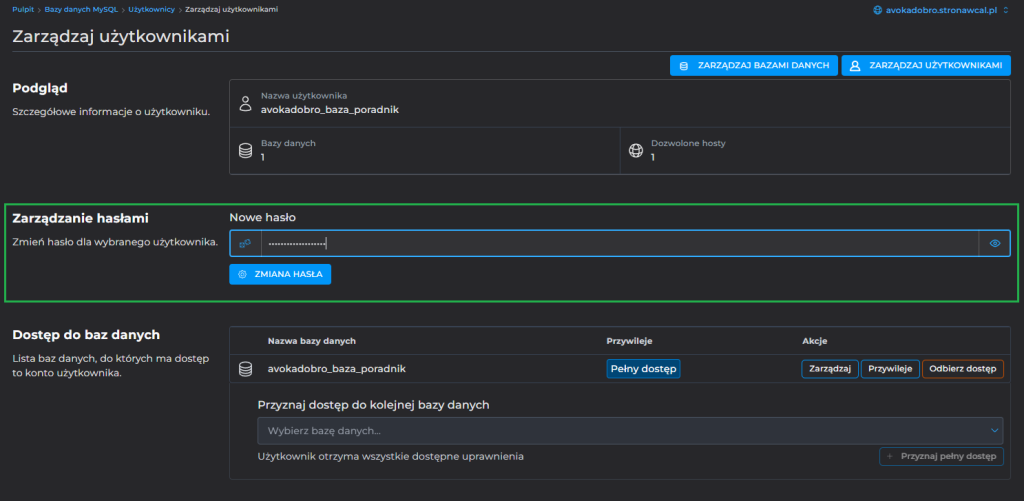 W sekcji Zarządzanie hasłami wpisujemy nasze nowe hasło do bazy danych i później potwierdzamy to klikając przycisk Zmiana hasła: